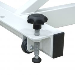 Base en T de acero para postes de voleibol de 101 mm de diámetro. Fijación sin anclajes de suelo, ajuste con perillas de estrella y ruedas integradas para transporte.