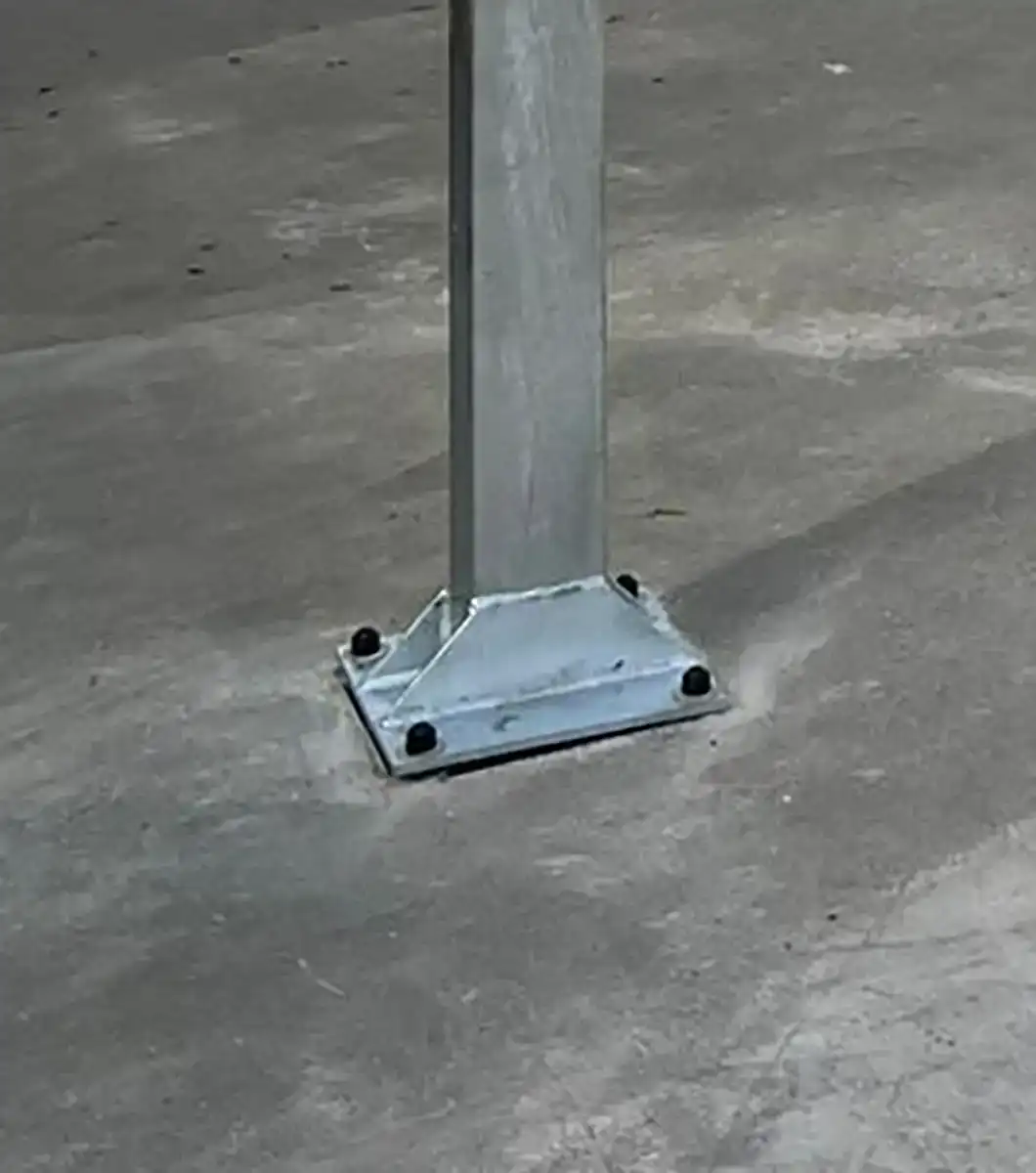 Canasta fija exterior con tablero en fibra de vidrio, poste central de 100x150x4 mm, extensión 165 cm aro reforzado reglamentario y estructura resistente a la intemperie.