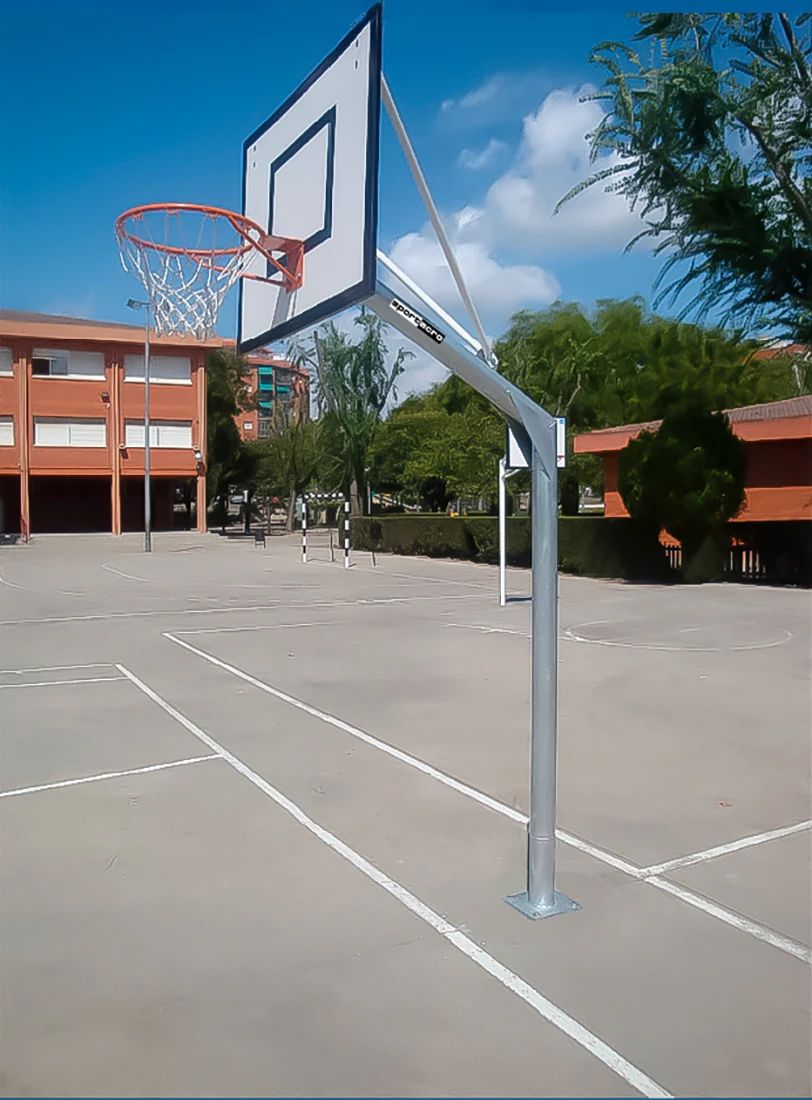 Unidad canasta de minibàsquet reglamentaria escolar fija al pavimento con anclaje desmontable modelo Thebe tablero en fibra de vidrio. Según norma EN1270. Precio por unidad.