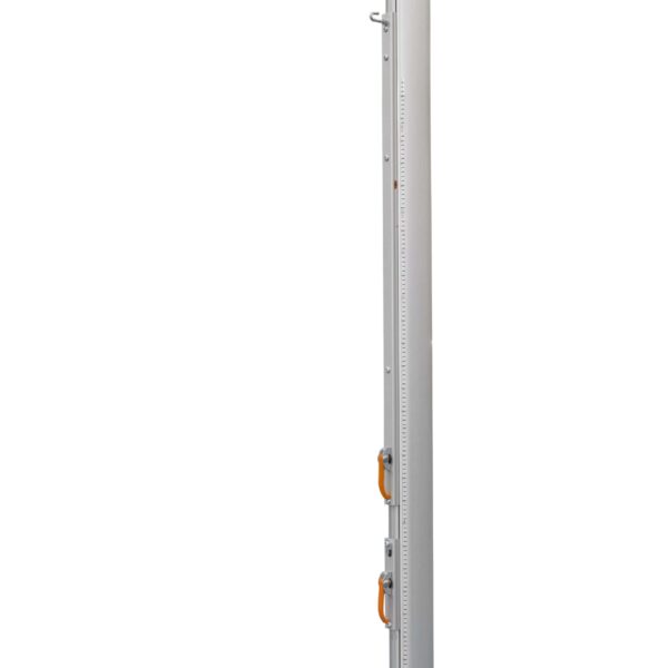 El diseño incorpora marcas de altura reglamentarias para agilizar la regulación de la red conforme a las normativas oficiales. Los topes de goma en los extremos protegen la superficie de juego, evitando daños en el suelo y asegurando una mayor estabilidad. Este poste está diseñado para su uso en bases empotradas, garantizando una sujeción firme y segura.