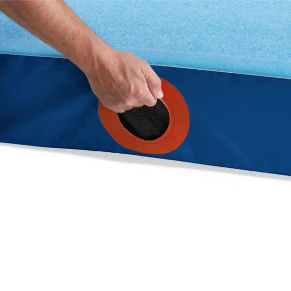 Colchoneta de recepción certificada por la FIG, Original REUTHER, especialmente diseñada para absorber los impactos de la recepción de los ejercicios. Cuenta en su interior con un entramado especial de poliéster integrado entre las diferentes capas de espuma, así como de estabilizadores laterales adicionales en los bordes. Dispone en sus laterales de agarres prácticos patentados que además de facilitar la evacuación del aire del interior ayudan a un sencillo traslado de la colchoneta. Base antideslizante y acabado superior en moqueta aterciopelada en color azul SPIETH con velcro perimetral que le permite unirse a otras colchonetas MOSCOW mediante Velcro (no incluido).